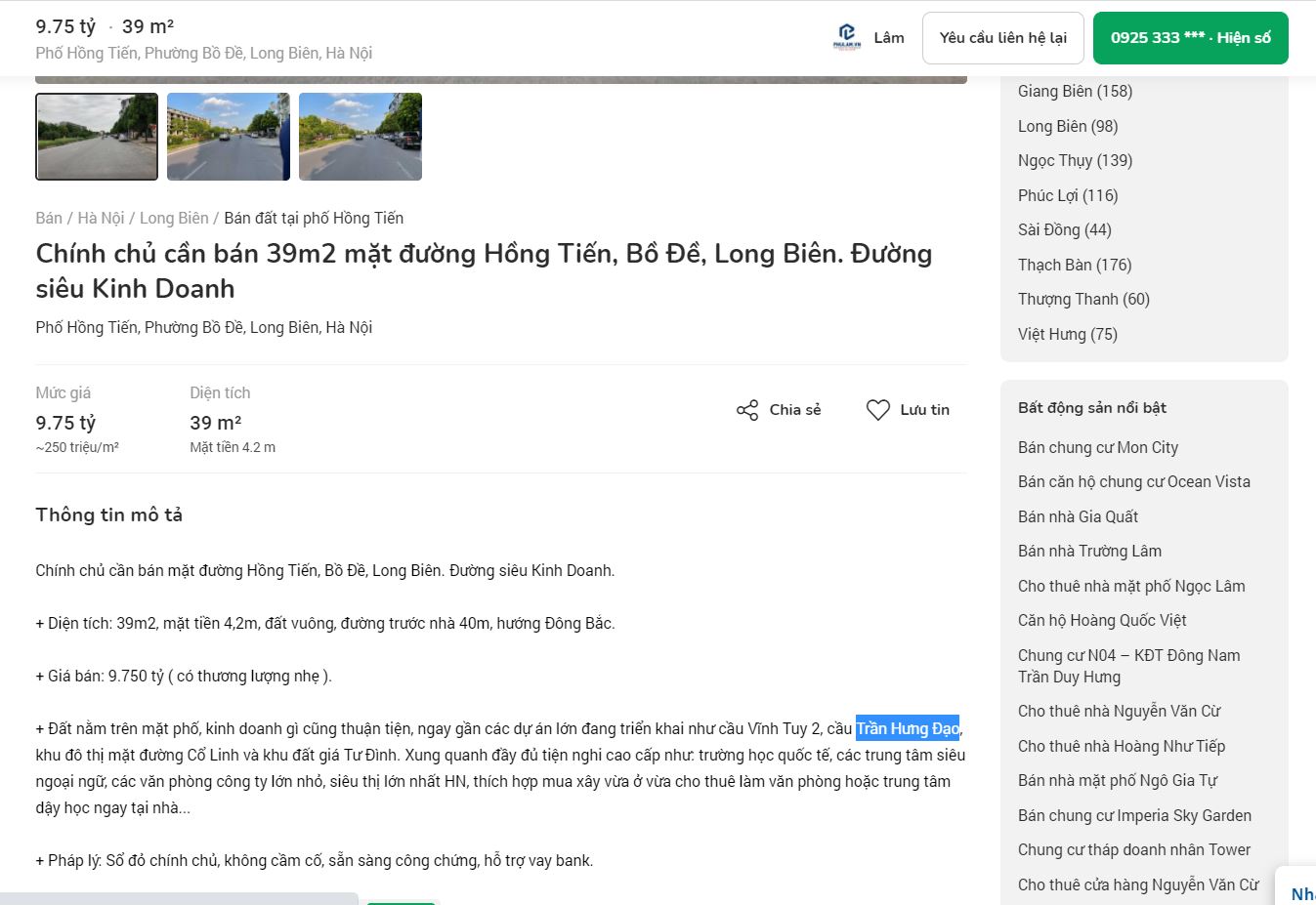 Theo khảo sát của PV, tại khu vực Cổ Linh (quận Long Biên) quy hoạch đầu cầu Trần Hưng Đạo, miếng đất rộng 270m2 mặt tiền 40m với giá 75 tỷ đồng (trung bình gần 280 triệu đồng/m2 đang được rao bán. Người bán mời chào, ô đất nằm ở mặt phố mới, tương lai đẹp nhất quận Long Biên vì ngay điểm giao với đường dẫn lên cầu Trần Hưng Đạo.
