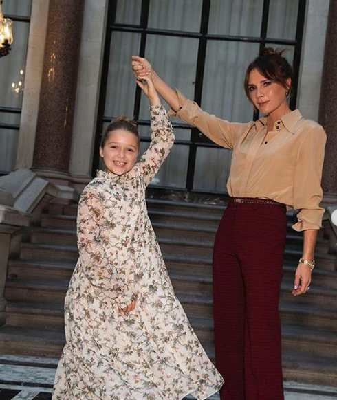 Haper xinh xăn trong váy hoa thướt tha chụp ảnh cùng mẹ Victoria tại hậu trường Show diễn |