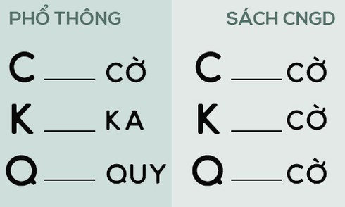 Riêng chữ cái “q”, không học sinh nào trước kia được giáo viên dạy mang âm “cờ”. Học sinh chỉ được dạy chữ cái “q” luôn đi chung với chữ cái “u” và đọc là “quờ” (miền Nam đọc là “quơ”). Ví dụ từ “quả” đánh vần là “quờ - a - qua - hỏi - quả” (hoặc “a - hỏi - ả - quơ - ả - quả”). Chứ học sinh không hề biết cách đánh vần lạ lùng “cờ - u - cu - a - coa - hỏi - quả”.