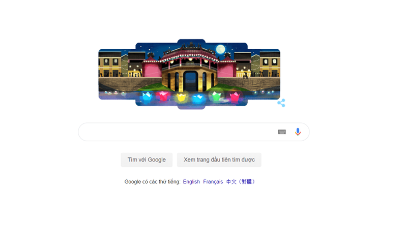 Hình ảnh Chùa Cầu, biểu tượng của Hội An lung linh dưới ánh đèn lồng xuất hiện trên trang chủ Google Doodles tiếng Việt. |