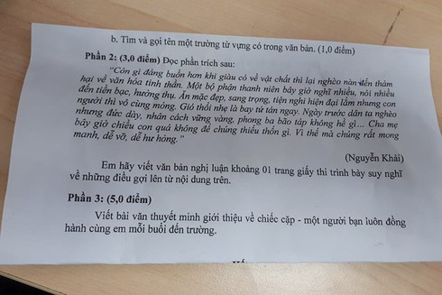 Câu hỏi 3 điểm này đưa ra đoạn trích của nhà văn Nguyễn Khải: “Còn gì đáng buồn hơn khi mà giàu có về vật chất thì lại nghèo nàn đến thảm hại về văn hóa tinh thần. Một bộ phận thanh niên bây giờ nghĩ nhiều, nói nhiều đến tiền bạc, hưởng thụ. Ăn mặc đẹp sang trọng, tiện nghi hiện đại lắm, nhưng con người thì vô cùng mỏng. Gió thổi nhẹ là bay biến tứ tán ngay. Ngày trước dân ta nghèo nhưng đức dày, nhân cách vững vàng, phong ba bão táp không hề gì,… chung quy tại giáo dục mà ra. Cha mẹ bây giờ chiều con quá, không để chúng thiếu thốn gì. Vì thế mà chúng rất mong manh, dễ vỡ, dễ hư hỏng“. Đề bài yêu cầu học sinh viết văn bản nghị luận khoảng 1 trang giấy thi trình bày suy nghĩ về những điều gợi lên từ nội dung trên.
