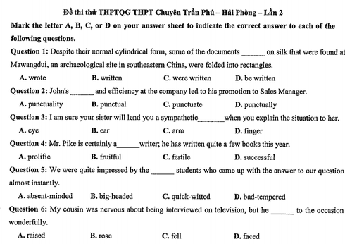 Sau đây là đề thi thử THPT quốc gia 2018 môn Tiếng Anh trường THPT Chuyên Trần Phú lần 2:
