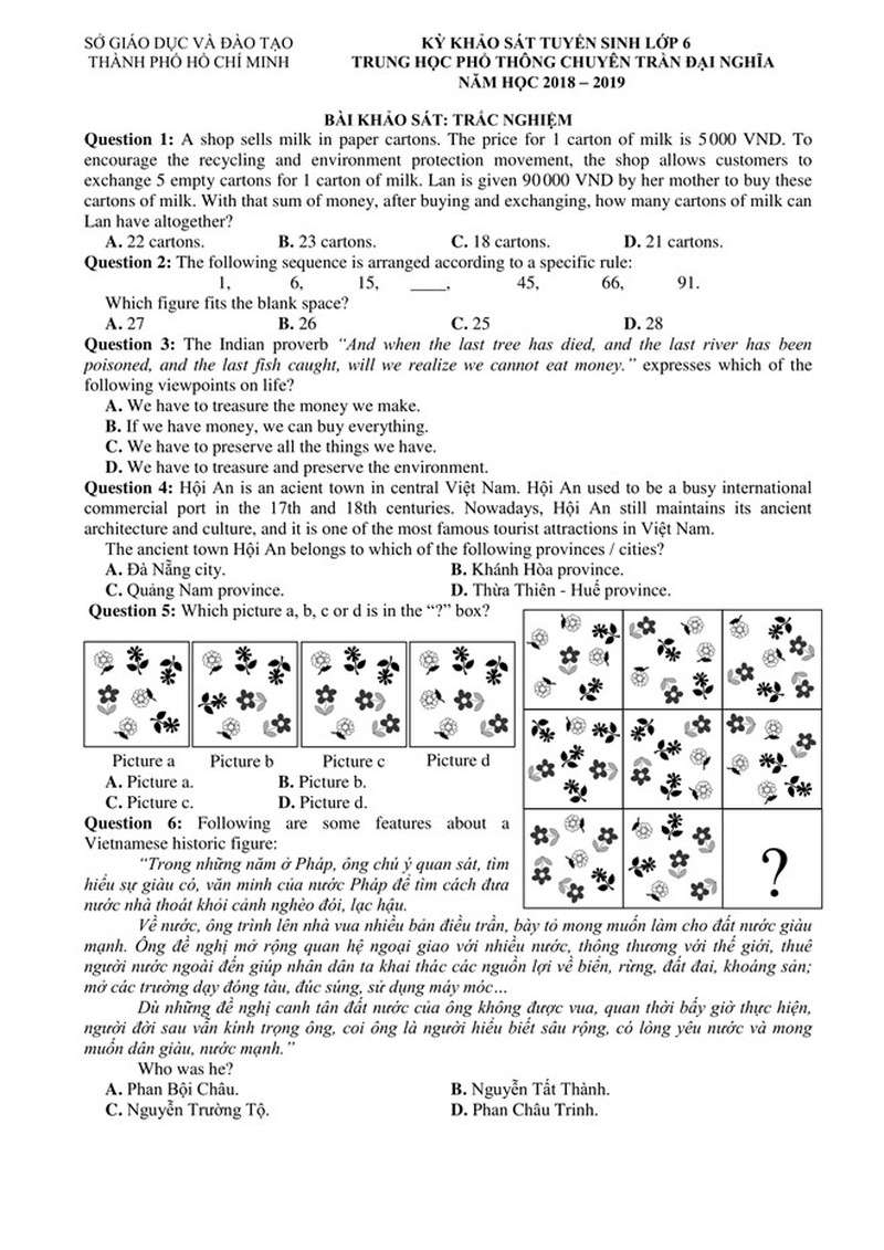 Là trường duy nhất tại TPHCM kiểm tra đầu vào lớp 6, năm nào tỷ lệ chọi vào lớp 6 THPT chuyên Trần Đại Nghĩa cũng ở mức rất cao. Xin giới thiệu đề và đáp án bài khảo sát năng lực trong kỳ kiểm tra đầu vào lớp 6 năm 2018 của Trường THPT chuyên Trần Đại Nghĩa.