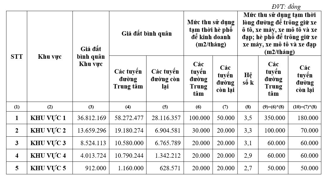 Cụ thể, khu vực 1 sẽ bao gồm các quận trung tâm TP như 1, 3, 4, 5,10, Phú Nhuận, Khu A Khu đô thị mới Nam TP, Khu đô thị mới Thủ Thiêm) với mức thu sử dụng tạm thời hè phố để kinh doanh được đề xuất từ 50.000 – 100.000 đồng/m2/tháng. Mức thu sử dụng tạm thời lòng đường để trông giữ xe ôtô, xe máy, xe mô tô và xe đạp; sử dụng hè phố để trông giữ xe máy, xe mô tô và xe đạp từ 180.000 - 350.000 đồng/m2/tháng.