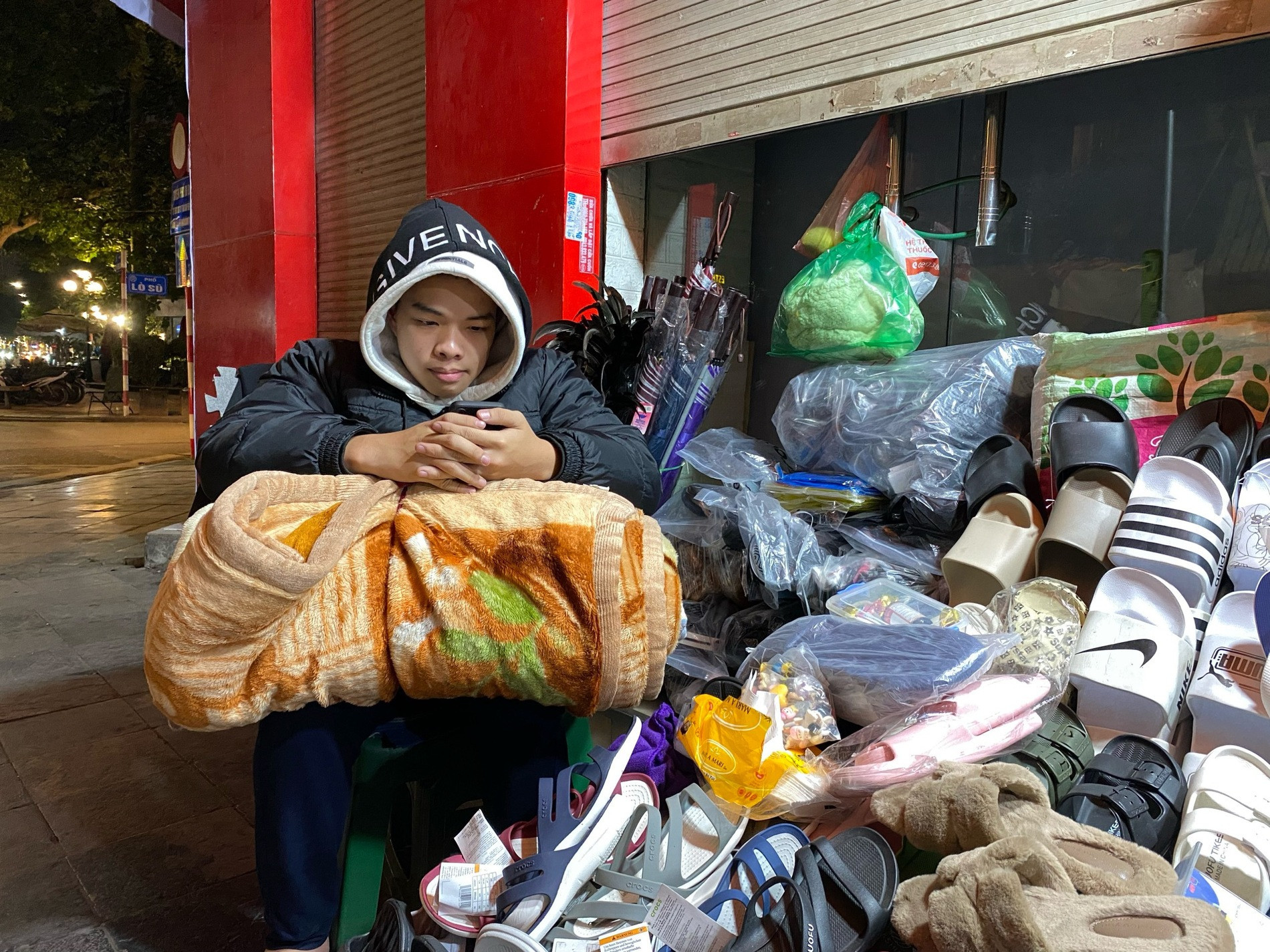 Sau mỗi giờ học, Nguyễn Duy Bảo phụ mẹ kinh doanh giày dép. Hà Nội về khuya, nhiệt độ giảm sâu, em ôm chặt chăn nhằm giữ ấm cơ thể để tiếp tục bán hàng.