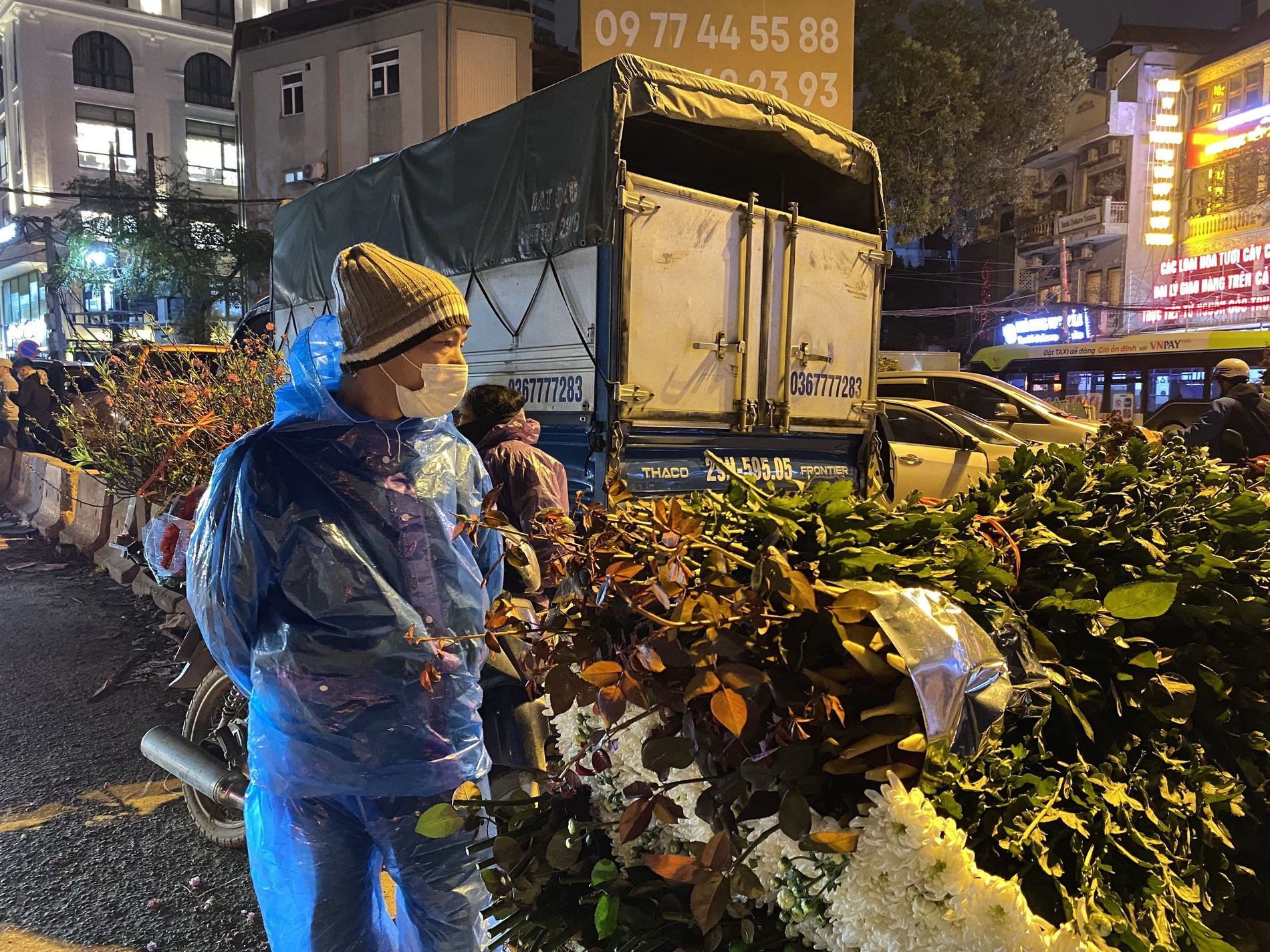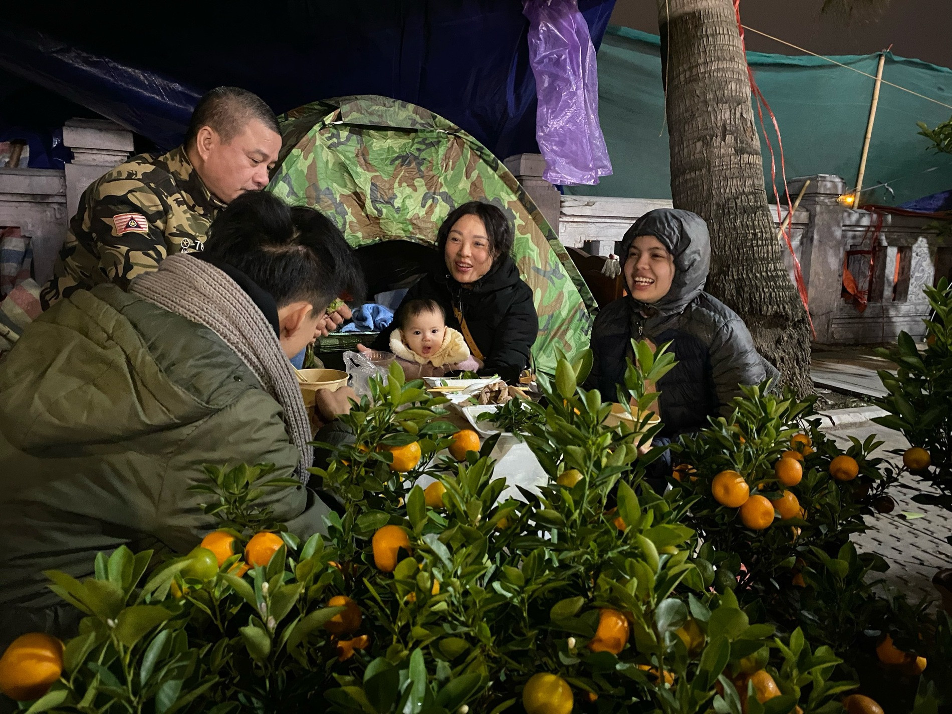 “Mình bán ở đây được 5-6 năm rồi, thường là bán từ 7h sáng đến 12h đêm. Mấy nay rét buốt quá nhưng vẫn cố gắng ra phụ chồng trông hàng, bé còn nhỏ nhưng ở nhà không có ai chăm nên cũng mặc nhiều áo ấm rồi mang con ra ngoài này. Tối đến gia đình dựng lều, căng bạt để tránh rét”.