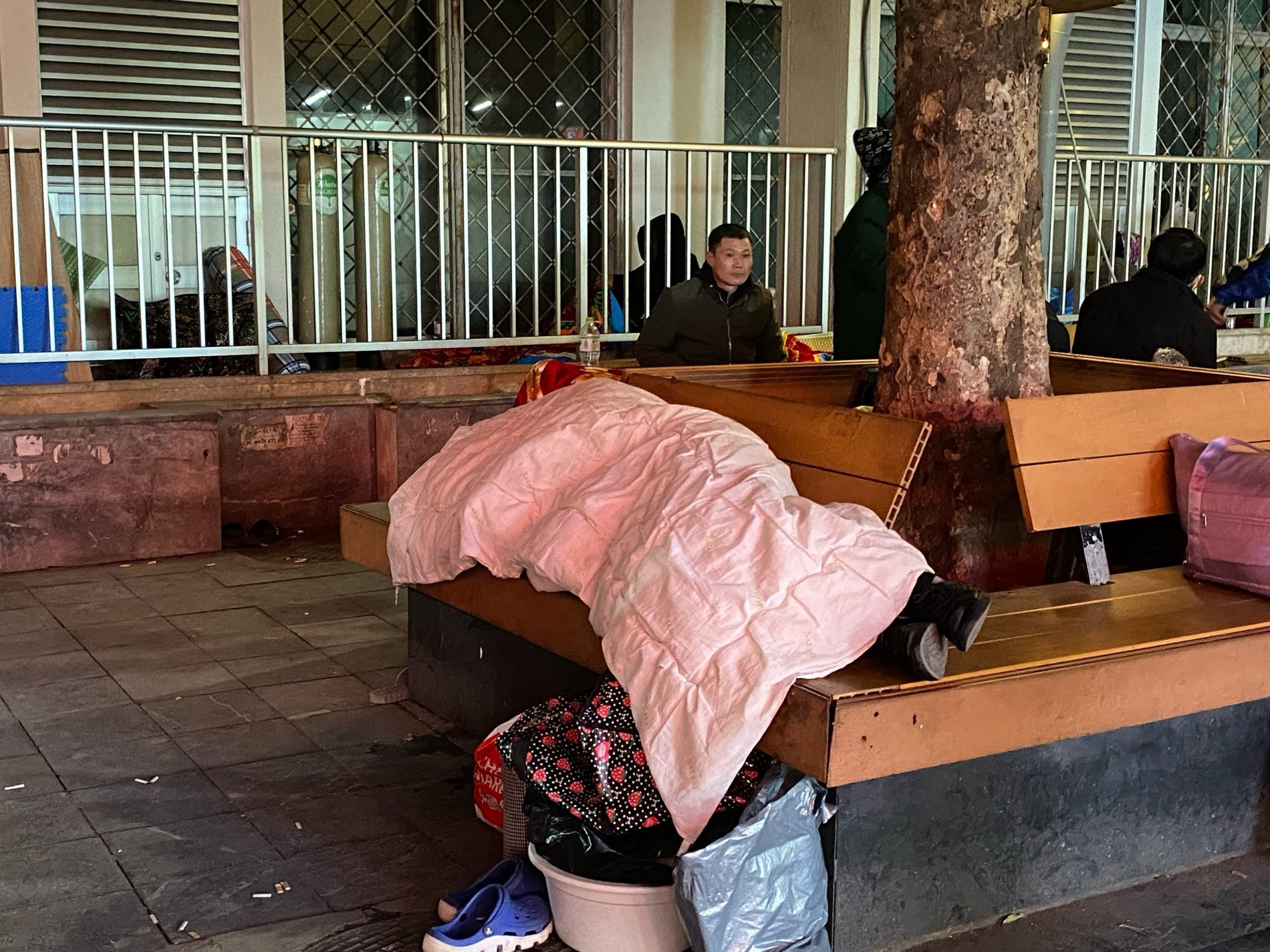 Tại nhà ga Hà Nội, không khó để bắt gặp hình ảnh người dân co ro nơi sảnh chờ. Một số người vô gia cư dùng bao tải, bìa các tông…và tất cả những gì có thể đắp được để làm thành chiếc giường nghỉ ngơi.
