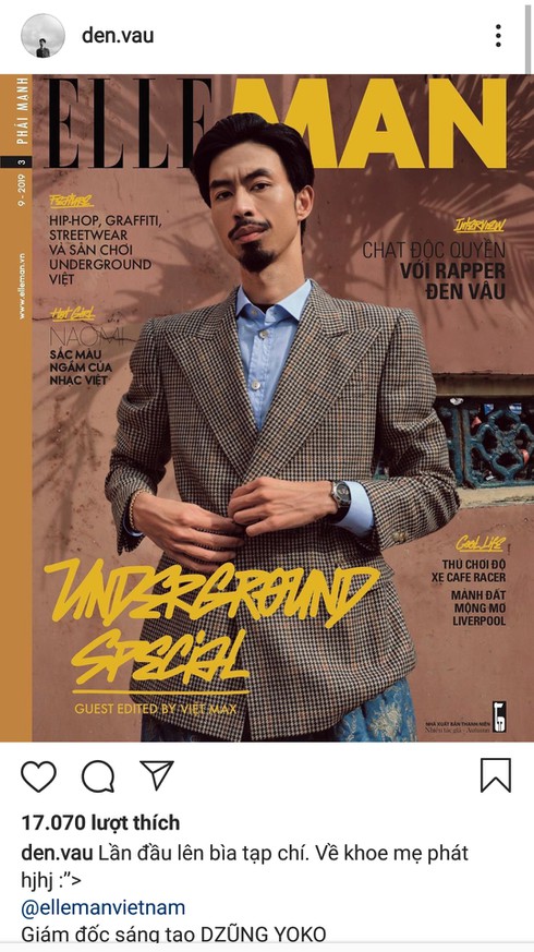 Mới đây, anh chàng rapper có dàn đồng âm lớn nhất Việt Nam – Đen Vâu thể hiện sự phấn khích trên trang cá nhân của mình khi lần đầu được đăng hình lên trang bìa của một tờ tạp chí lớn là ELLE MAN, không còn là chàng Đức Cường quét rác ngày nào hay chàng ca sĩ trẻ Đen Vâu đầy đam mê và nhiệt huyết cháy hết mình trên sân khấu cùng khán giả, giọng ca Hai triệu năm gây khác lạ với hình ảnh mặc vest bảnh bao, lịch lãm.