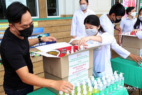 Đại diện các chốt kiểm soát dịch Covid-19 tại các cửa ngõ ra vào TP Đà Nẵng tiếp nhận nước sát khuẩn khô UDA do giảng viên, sinh viên ĐH Đông Á hỗ trợ (Ảnh: HC) |