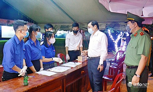 Chủ tịch UBND TP Đà Nẵng Huỳnh Đức Thơ và Giám đốc Công an TP, Thiếu tướng Vũ Xuân Viên đến thăm, động viên cácthanh niên tình nguyên đang túc trực 24/24 tại các chốt kiểm soát dich Covid-29 ở các cửa ngõ ra vào TP |