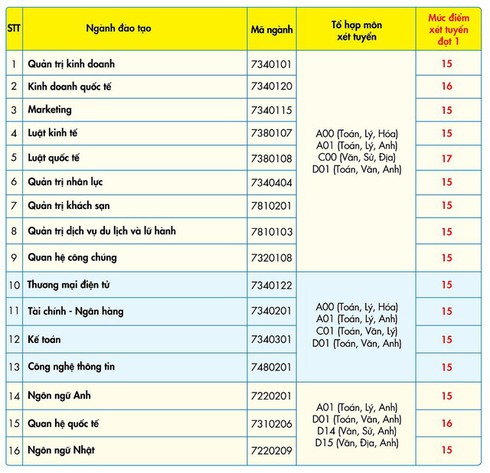 Theo đó, mức điểm nhận hồ sơ xét tuyển cao nhất thuộc về ngành Luật quốc tế là 17 điểm. Ngành Kinh doanh quốc tế và ngành Quan hệ quốc tế là 16 điểm, các ngành còn lại là 15 điểm.