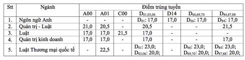Điểm chuẩn cao nhất là 23,0 đối với ngành Luật thương mại quốc tế (D01, D66, D84). Mức điểm thấp nhất là 17,0 với các ngành Ngôn ngữ Anh, Luật (A00, A01, D01, D03, D06), Quản trị kinh doanh.