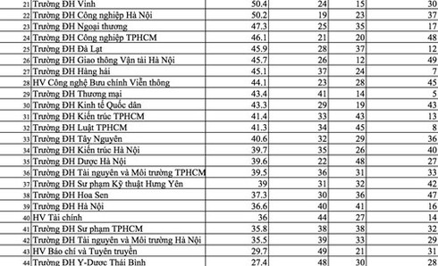 Điều đáng lưu ý là các trường ĐH khối kinh tế nổi tiếng, sự lựa chọn đầu tiên của nhiều học sinh giỏi lại có xếp hạng trung bình như trường ĐH Ngoại thương đứng thứ 23.Trong khi một số trường ít được biết đến lại nằm ngay top đầu của bảng xếp hạng như: ĐH Tôn Đức Thắng vị trí số 2, ĐH Duy Tân vị trí số 9.