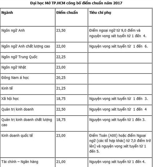 Điểm chuẩn chính thức của Đại học Mở TP.HCM cao nhất là 23,5 điểm (ngành Ngôn ngữ Anh). Trường có các tiêu chí phụ khi xét tuyển.