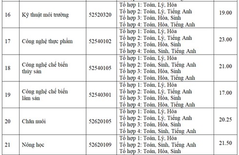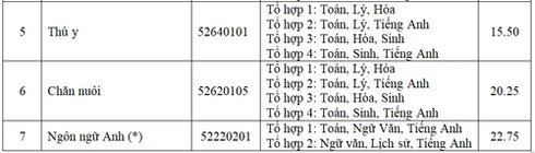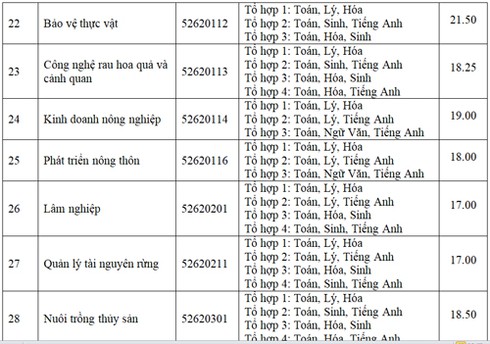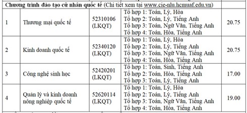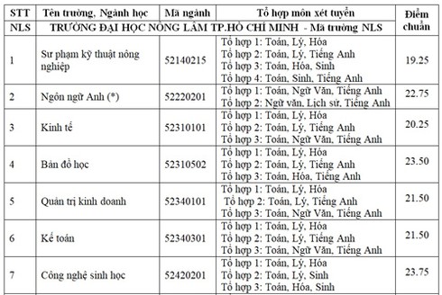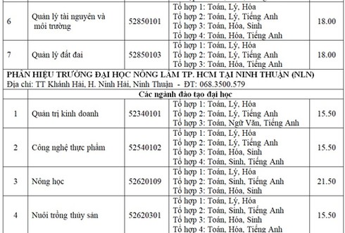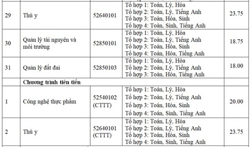 Điểm chuẩn cao nhất Đại học Nông lâm TP.HCM là ngành Thú y, Công nghệ sinh học với 23,75 điểm, trong khi một số ngành khác lấy bằng điểm sàn: 15,5.