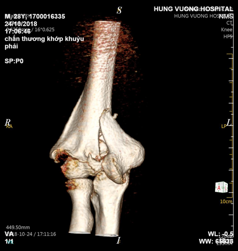 Kết quả chụp CT cánh tay cho thấy hình ảnh vỡ nhiều mảnh kèm di lệch xương lồi trong và ngoài cầu xương cánh tay phải. Sau khi bác sỹ giải thích tình trạng chấn thương của bệnh nhân cho người nhà, bệnh nhân được thực hiện phẫu thuật kết hợp xương trên, liên lồi cầu cánh tay.