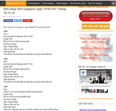 Thông tin tuyển dụng lao động đi làm việc ở Singapore với mức lương từ 20 đến 35 triệu đồng/tháng được đăng tải trên một số trang mạng. |