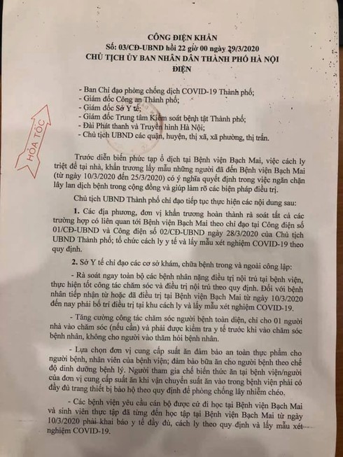 Các địa phương, đơn vị khẩn trương hoàn thành rà soát tất cả các trường hợp có liên quan tới BV Bạch Mai theo chỉ đạo tại Công điện 01/CĐ – UBND và Công điện số 01/CĐ- UBND ngày 28/3 của Chủ tịch UBND TP, tổ chức cách ly y tế và lấy mẫu xét nghiệm Covid- 19 theo quy định.