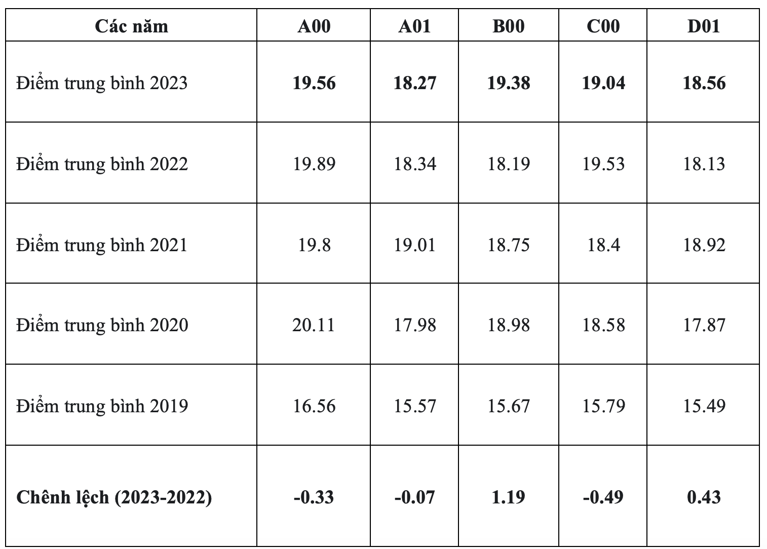 Các trường top dưới điểm khối A00 giảm 0,5 đến 1,5 điểm. Khối A01 điểm chuẩn sẽ không đổi. Khối B00 điểm chuẩn năm 2023 sẽ tăng 0,5 đến 1 điểm so với năm 2022. Khối D01 điểm chuẩn năm 2023 sẽ tăng 0,5-1,5 điểm so với năm 2022.