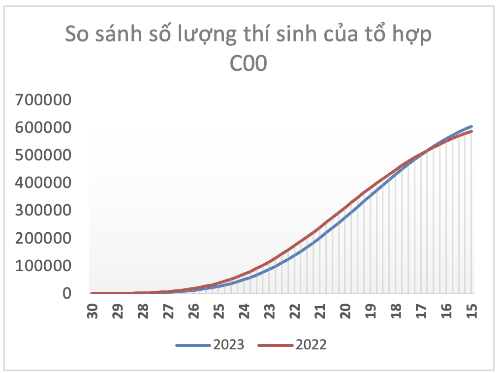 Tổ hợp B00, số thí sinh điểm từ 24 điểm đến 30 điểm tăng hơn 8,5 nghìn. Tổ hợp C00, số thí sinh điểm từ 24 điểm đến 30 điểm giảm gần 20 nghìn. Tổ hợp D01, số thí sinh điểm từ 24 điểm đến 30 điểm tăng hơn 15 nghìn. Cho nên, điểm sàn (trừ khối ngành Sư phạm, Y Dược) phần lớn ở nhiều trường sẽ vẫn ở mức 15 điểm (tương đương năm 2022).