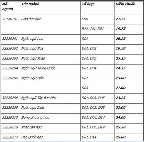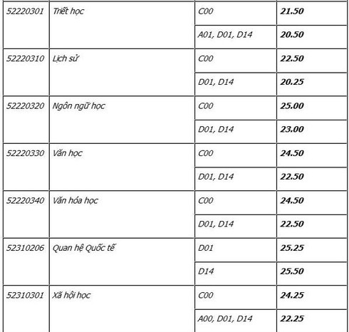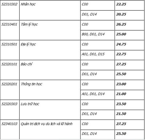 Theo đó, tất cả các ngành của trường đều có điểm chuẩn cao hơn năm ngoái. Trong đó, có hai ngành xét khối C00 có mức điểm kỷ lục, cao nhất từ trước đến nay: 27,25 điểm. Đó là ngành báo chí và ngành quản trị dịch vụ du lịch và lữ hành. Trong khi đó, điểm khối D01, D14 của hai ngành này là 25,5 điểm.