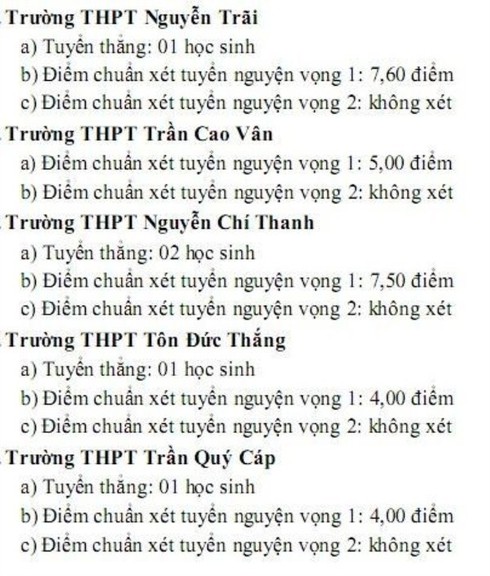 Đó là 3 trường có điểm chuẩn 4 điểm bao gồm Trường THPT Tôn Đức Thắng, Trường THPT Trần Quý Cáp (2 trường này không xét nguyện vọng 2), Trường THPT Tô Văn Ơn (điểm xét tuyển nguyện vọng 2 là 7,7), và Trường THPT Đoàn Thị Điểm có điểm chuẩn là 4,2 (điểm xét tuyển nguyện vọng 2 là 7,4).