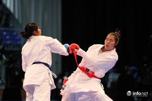 Hồ Thị Thu Huyền, Nguyễn Minh Phụng lại đem vàng về cho Karatedo Việt Nam sau chiến thắng tại nội dung Kumite ngày 23/8. (Ảnh: Nam Nguyễn) |