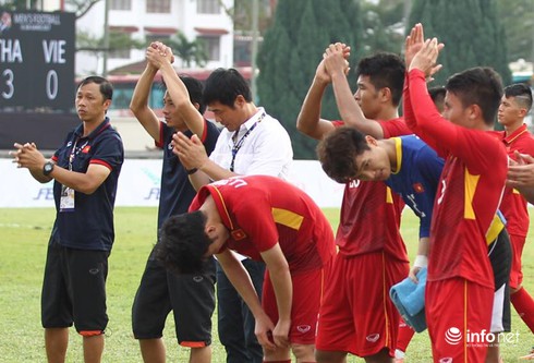 Thầy trò HLV Hữu Thắng xin lỗi khán giả và người hâm mộ sau trận thua Thái Lan. (Ảnh: Nam Nguyễn) |