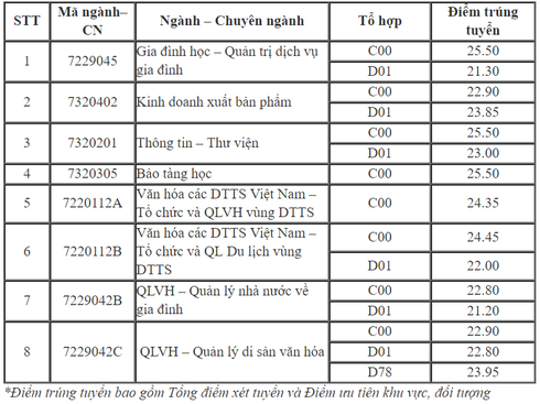 Điểm chuẩn thấp nhất là ngành Quản lý văn hóa - Quản lý nhà nước về gia đình, tổ hợp D01 là 21,2 điểm.