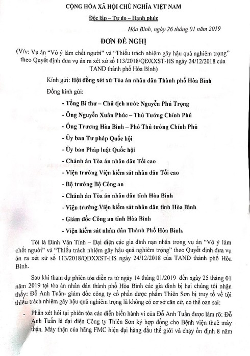 Đơn kiến nghị của ông Đinh Văn Tính, bố đẻ của nạn nhân Đinh Thị Thu Hằng. |
