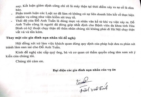 Điều bất ngờ đã diễn ra ngay sau phiên xử cuối cùng 01 ngày, đại diện các gia đình nạn nhân - ông Phạm Ngọc Thạo và ông Đinh Văn Tính đã có Đơn đề nghị gửi đến Hội đồng xét xử và các cơ quan cấp lãnh đạo Trung ương với nội dung “Đề nghị Hội đồng xét xử làm việc khách quan, đúng quy định của pháp luật đưa ra phán xét tránh làm oan sai cho Đỗ Anh Tuấn”.