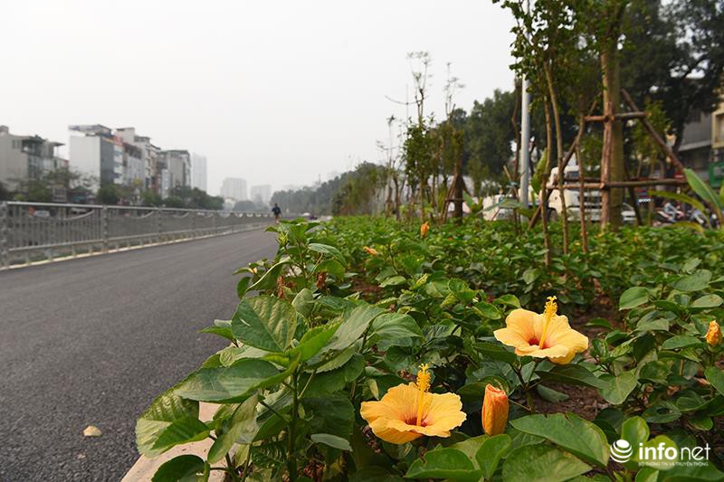 Dải phân cách được trồng 3 tầng cây với nhiều loại hoa như tường vi, hoa giấy, phượng... |
