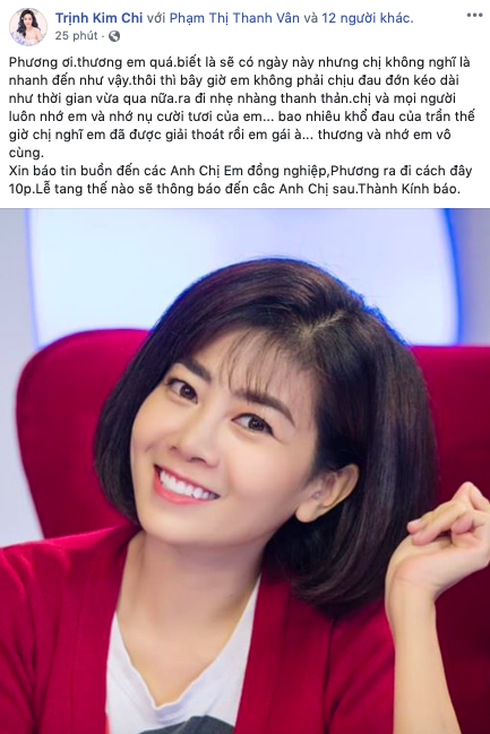 Xin báo tin buồn đến các Anh Chị Em đồng nghiệp,Phương ra đi cách đây 10p.Lễ tang thế nào sẽ thông báo đến câc Anh Chị sau.Thành Kính báo! - Nữ nghệ sĩ Trịnh Kim Chi thông báo tin buồn.
