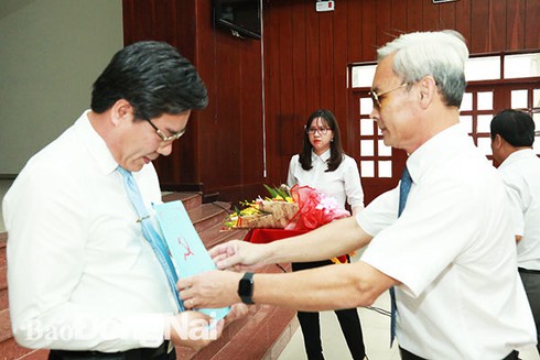 | Ủy viên Trung ương Đảng, Bí thư Tỉnh ủy Nguyễn Phú Cường trao quyết định của Ban TVTU cho ôngDương Minh Dũng. Ảnh: báo Đồng Nai |