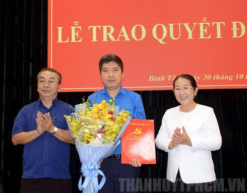 | Phó Bí thư Thành ủy TP Võ Thị Dung và Bí thư Quận ủy Quận Bình Tân Võ Ngọc Quốc Thuận trao quyết định và tặng hoa chúc mừng ôngNguyễn Việt Quế Sơn. Ảnh: Thành ủy TP.HCM |