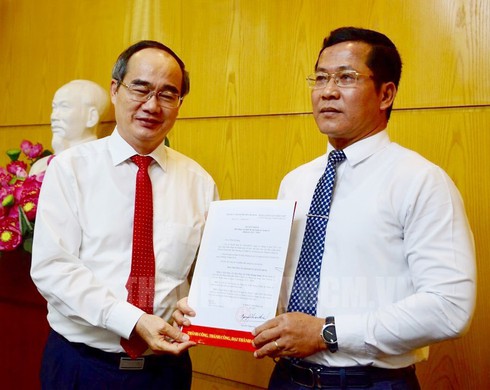 | Bí thư Thành ủy Nguyễn Thiện Nhân trao quyết định cho ông Trần Hoàng Danh. Ảnh: Thành ủy TP.HCM |