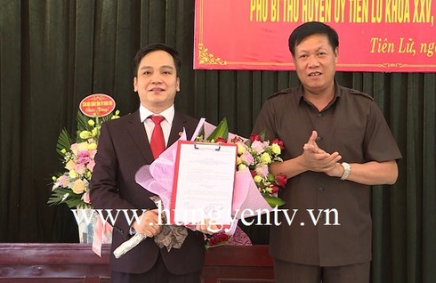 | Phó Bí thư Thường trực Tỉnh ủy Đỗ Xuân Tuyên trao quyết định cho ông Bùi Tiến Duy. Ảnh: Truyền hình Hưng Yên |