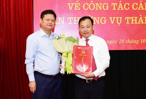 | Trưởng ban Tổ chức Thành ủy Vũ Đức Bảo trao quyết định cho ông Lương Chí Công. Ảnh: báo Hà Nội mới |