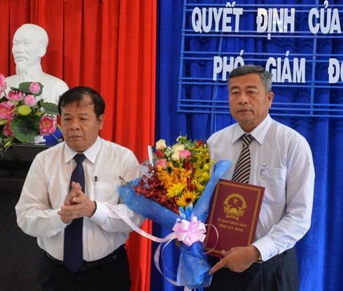 Chủ tịch UBND tỉnh Tây Ninh Phạm Vân Tân trao quyết định điều động ông Võ Minh Tâm.(ảnh: baotayninh) |