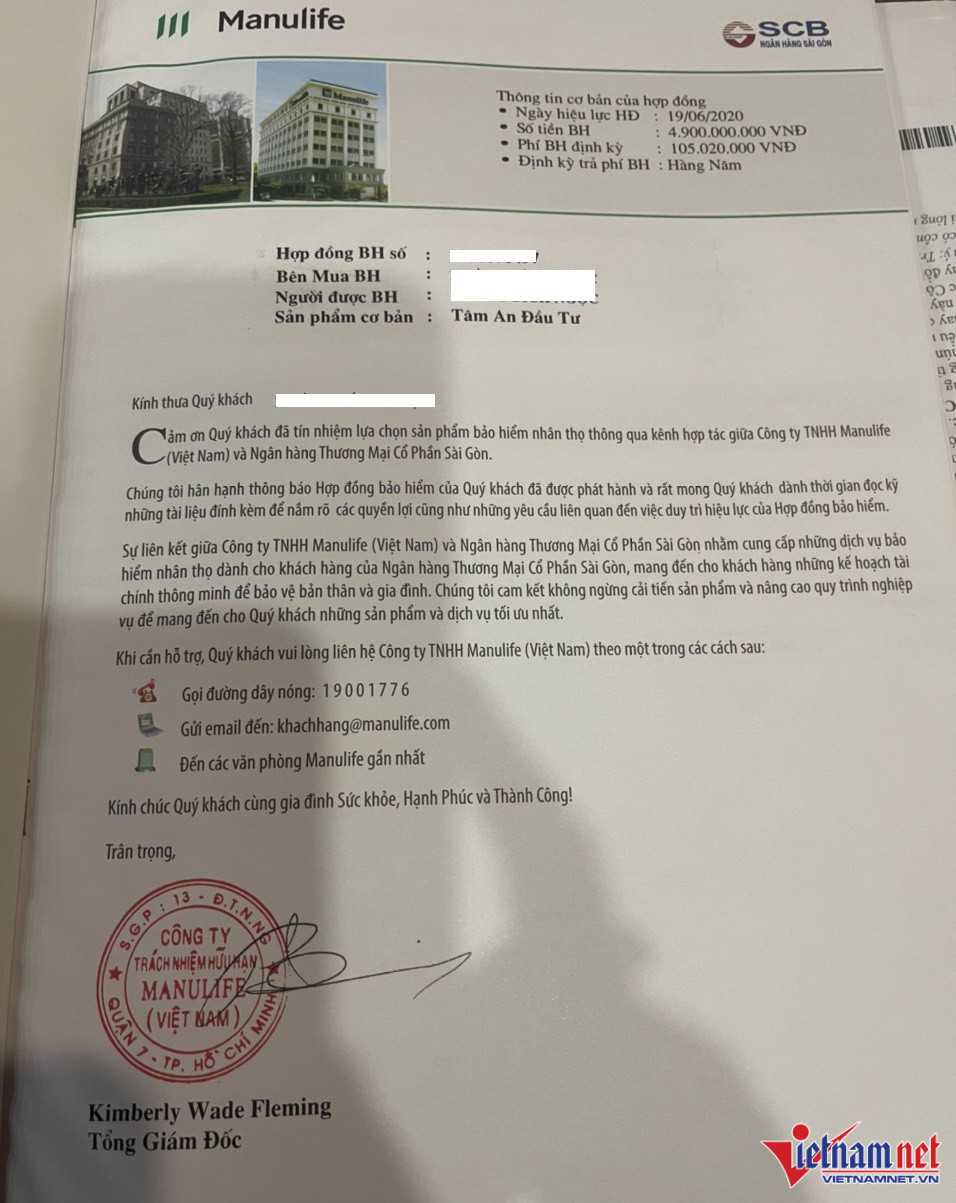 “Tức là, chị H. này đề nghị tôi tiếp tục gửi tiết kiệm tại SCB, nhưng mỗi năm 'cấu' ra 105 triệu đồng để đầu tư vào sản phẩm mới, trong khi vẫn được hưởng lãi suất cao hơn lãi gửi tiết kiệm. Tuy nhiên, phải cam kết không rút trước 7 năm. Kèm theo đó, ngân hàng sẽ có quà tặng là sản phẩm bảo hiểm từ đối tác Manulife”, bà H.B.N. kể.