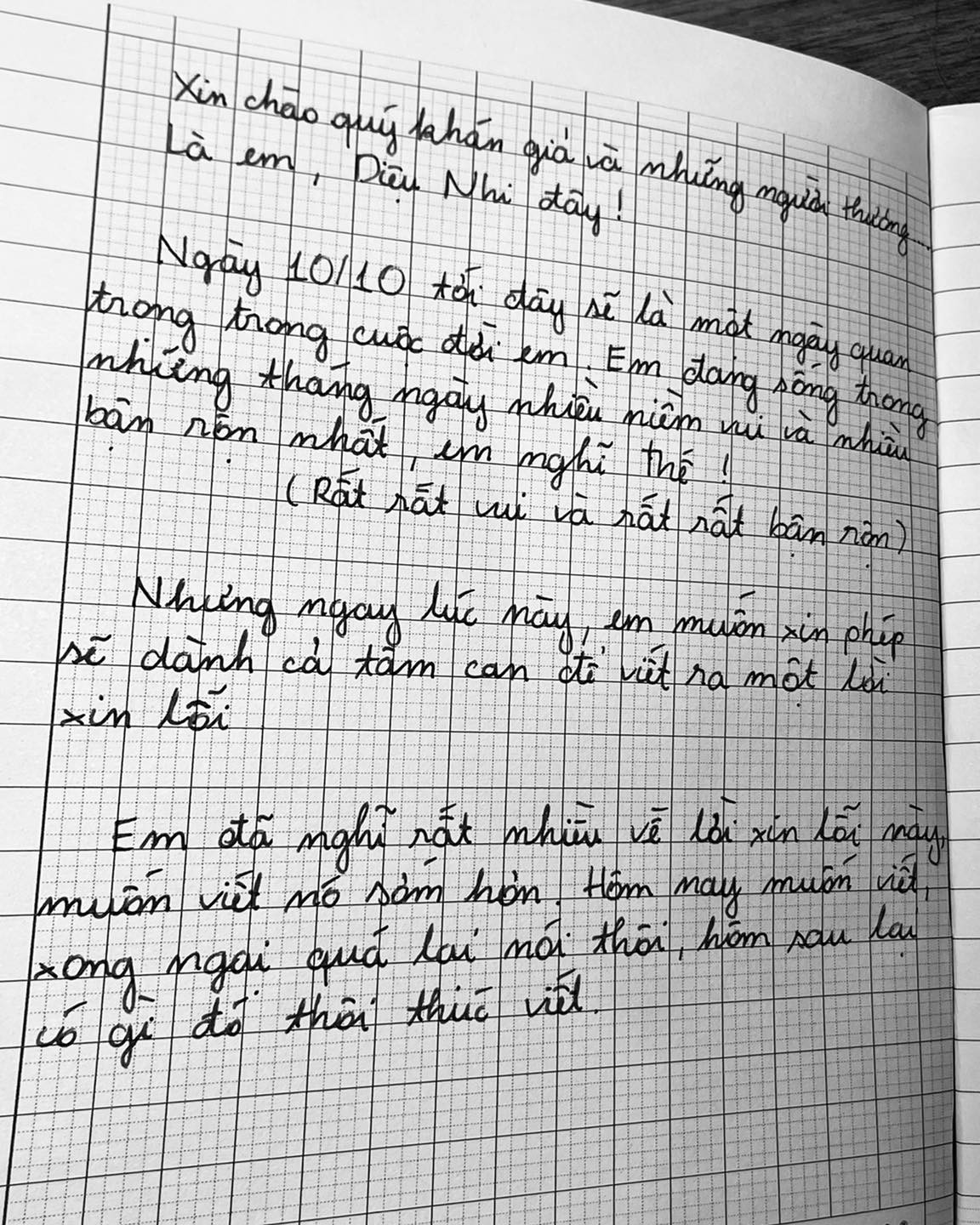 Nhưng ngay lúc này em muốn xin phép sẽ dành cả tâm can để viết ra một lời xin lỗi. Em đã nghĩ rất nhiều về lời xin lỗi này, muốn nó viết sớm hơn. Hôm nay muốn viết xong ngại quá lại nói thôi, hôm sau lại có gì đó thôi thúc viết.