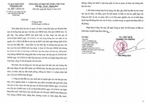 Khi vào cuộc xác minh, các ngành chức năng tỉnh Đắk Lắk xác định đây là trường hợp giả mạo văn bản của Chủ tịch UBND tỉnh. Thực tế, Chủ tịch UBND tỉnh không ban hành bất cứ văn bản nào có nội dung và thể thức như bản chụp văn bản đã nêu trên.
