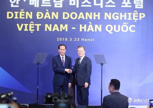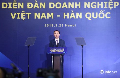 Phát biểu tại Diễn đàn doanh nghiệp Việt Nam - Hàn Quốc do Phòng Thương mại và Công nghiệp Việt Nam (VCCI) tổ chức chiều ngày 23/3 tại Hà Nội, Chủ tịch nước Trần Đại Quang nhận định cộng đồng doanh nghiệp Hàn Quốc tại Việt Nam không chỉ đóng vai trò tiên phong trong hợp tác đầu tư mà còn thúc đẩy quan hệ hợp tác giữa hai nước trên các lĩnh vực đi vào thực chất và hiệu quả hơn.