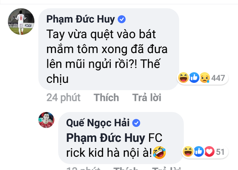 Soái ca ngời ngời là thế nhưng Duy Mạnh cũng không thoát nổi "thánh cà khịa" Đức Huy. Dù sao thì tin hỷ của Duy Mạnh và Quỳnh Anh cũng là niềm vui đầu năm của đội tuyển Việt Nam đang được anh em chung vui chúc mừng.