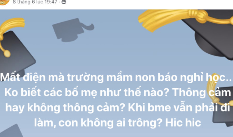Tôi có hỏi tại sao nhà trường không thuê máy phát điện, câu trả lời nhận được vẫn là hỏi nhiều nơi nhưng không có để thuê. Con tôi học trường tư, học phí 5 triệu đồng/tháng chưa kể tiền ăn nhưng cứ ba ngày lại nghỉ học vì cắt điện trong khi nhà trường không có phương án khắc phục, phụ huynh không thể yên tâm đi làm".