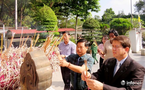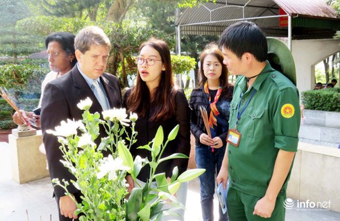 Ông Nguyễn Xuân Hải - Chủ tịch Hội Nhà báo Việt Nam tỉnh Hà Tĩnh và ông Jorge Leganona Alonso - Phó Chủ tịch Hội Nhà báo Cu Ba dâng hương tại Khu di tích lịch sử Ngã 3 Đồng Lộc. |