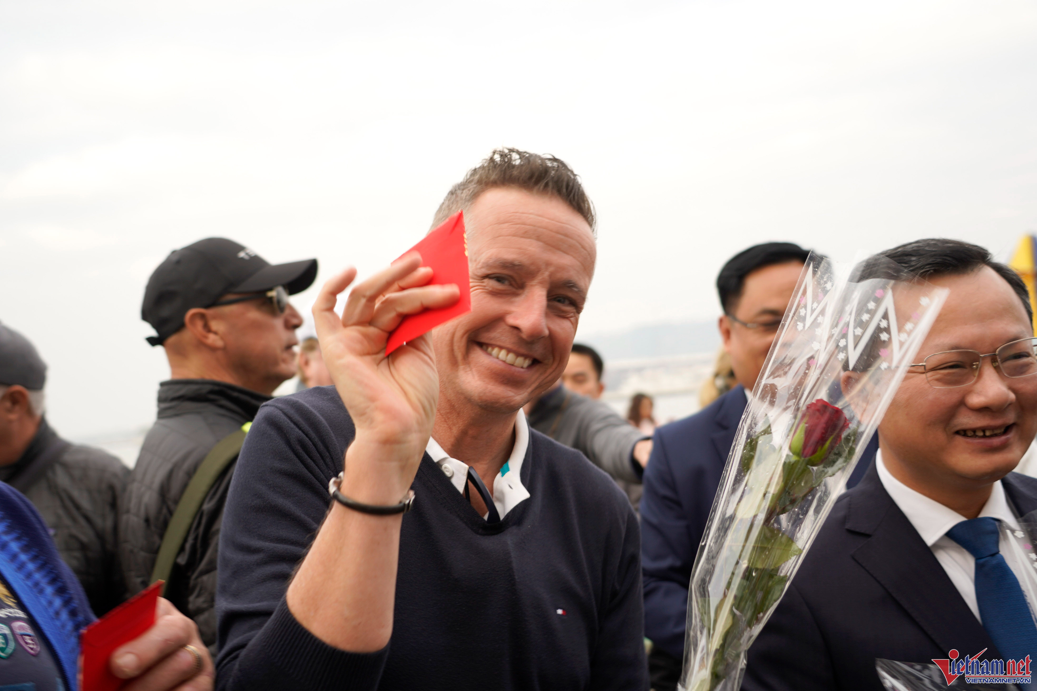 Tại khu vực cảng tàu, ông Cao Tường Huy, quyền Chủ tịch UBND tỉnh Quảng Ninh cùng lãnh đạo Sở Du lịch đã có mặt để tặng hoa và lì xì năm mới cho đoàn khách nước ngoài. Nhiều du khách rất mừng và bất ngờ khi đây là lần đầu tiên được nhận lì xì mừng tuổi.