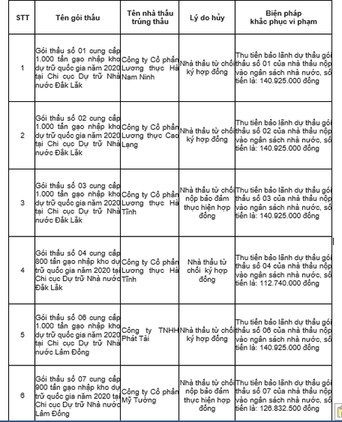 Trong đó, hủy 2 gói thầu đối với Công ty CP Lương thực Hà Nam Ninh. Còn lại 6 gói thầu của các doanh nghiệp khá c tu hơn 1,7 tỷ đồng tiền bảo đảm dự thầu của nhà thầu nộp vào ngân sách nhà nước.