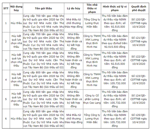 Tương tự, ngày 15/4, Cục Dự trữ Nhà nước khu vực Vĩnh Phú cũng thông báo hủy kết quả lựa chọn các nhà thầu trúng thầu và hủy thầu đối với 8 gói thầu thuộc dự án mua 9.500 tấn gạo nhập kho dự trữ quốc gia kế hoạch năm 2020. Lý do nhà thầu từ chối ký kết hợp đồng.