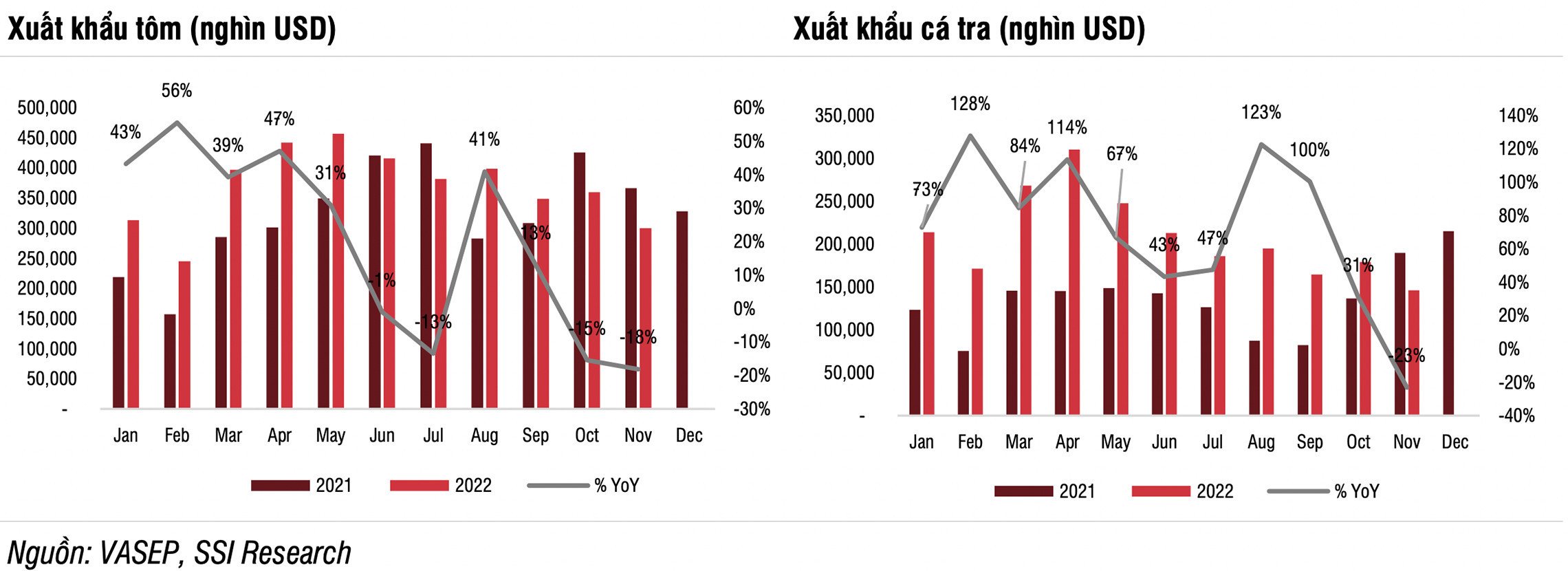 Từ quý IV/2022, ngành thuỷ sản bắt đầu đối mặt với nhiều khó khăn. Theo Hiệp hội Chế biến và Xuất khẩu thủy sản Việt Nam (VASEP), xuất khẩu cá tra của Việt Nam rơi xuống mức thấp nhất năm với 475 triệu USD trong quý cuối cùng của năm 2022, giảm 12% so với cùng kỳ năm 2021. Lý do là bởi tác động của lạm phát, đơn hàng từ các thị trường sụt giảm.